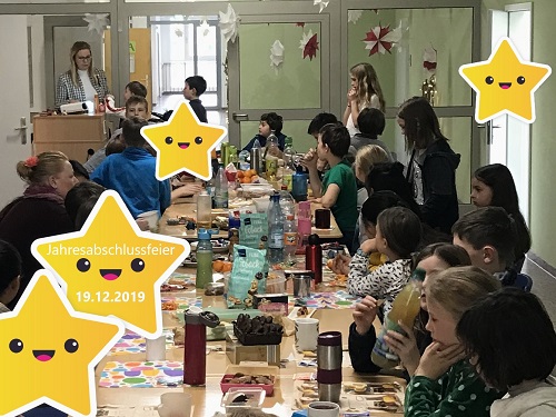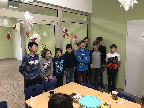Um das Jahr gemeinsam feierlich und besinnlich ausklingen zu lassen, trafen sich alle SchülerInnen der Klassen 05a, 05b und 05c am Donnerstag, dem 19.12.2019 in den letzten beiden Stunden an einer großen Tafel im Schulhaus. Diese war reich gedeckt mit selbstgebackenen Leckereien der SchülerInnen wie Plätzchen und Muffins, sowie heißem Tee und selbstgemachtem Eistee.