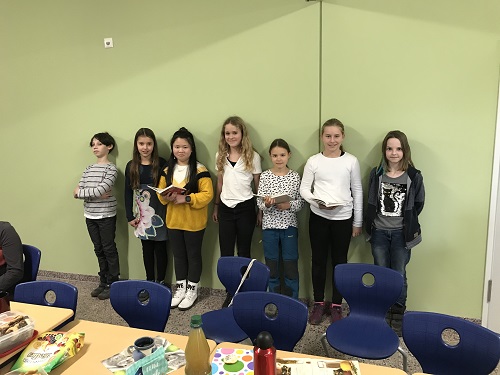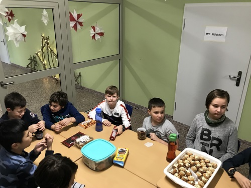 Um das Jahr gemeinsam feierlich und besinnlich ausklingen zu lassen, trafen sich alle SchülerInnen der Klassen 05a, 05b und 05c am Donnerstag, dem 19.12.2019 in den letzten beiden Stunden an einer großen Tafel im Schulhaus. Diese war reich gedeckt mit selbstgebackenen Leckereien der SchülerInnen wie Plätzchen und Muffins, sowie heißem Tee und selbstgemachtem Eistee.