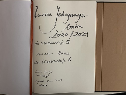 Besonders stolz sind wir auf unsere Jahrgangsbesten Alfred Schuster aus der Klassenstufe 05 mit einem Traumergebnis von 1,0 und Ioana Hunger und Elisabeth Klara Neradt aus der Klassenstufe 06. Diese drei SchülerInnen durften sich ins „Goldene Buch des Gymnasiums Dresden-Gorbitz“ eintragen.